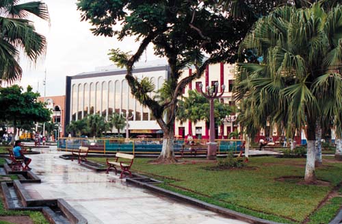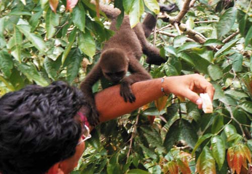 (Canopy walk way) weit drinnen im entlegenen Urwald (siehe Zeitschrift vom September) konnten Wenn sich die von Iquitos kommende Amazon Queen der Anlegestelle nähert kann man nicht erkennen, was das dichte Laub verbirgt. Nur eine die Baumgipfel etwas überragende Antenne lässt erahnen, dass es hier etwas mehr geben muß. Auf einem Pfad – mit Holz ausgelegt, um auch nach einem der üblichen Regenschauer nicht durch den Schlamm stampfen zu müssen – erreichen wir den Empfang an der Stirnseite eines aus Materialien des Waldes und im lokalen Stil erbauten großen Gebäudes. Während der Übergabe der Schlüssel für die Bungalows bedienen sich einige schon mit Kaffee, der Tag und Nacht – kostenlos – für die Gäste bereit steht. Nebenan die Bar, gefolgt von dem geräumigen Speiseraum. Die Mahlzeiten werden hier als Büfett serviert – in Vielfältigkeit und Qualität für anspruchsvolle Gäste. Ein Yacuzzi mit Hydromassage lädt gleich zum Entspannen im Wasser ein und wer sich nach mehr Aktivität sehnt, kann über die Wasserrutschbahn in das tiefer liegende, bei diesem warmen Klima so angenehmen Schwimmbecken eintauchen. Gut gepflegte Gartenanlagen laden zum Betrachten der typischen Urwaldpflanzen ein. Etwas abseits lädt ein geräumiger Saal mit Hängematten zum Ausruhen ein. Die Bungalows integrieren sich harmonisch in die Landschaft. Beim Öffnen der Türe überrascht die Frische der Klimaanlage und die tadellose Einrichtung mit privatem WC und Dusche. Fließendes Wasser, nicht nur kalt, es gibt es auch warm, und elektrisches Licht – als ob wir nicht inmitten des Dschungels wären. Mit allen Annehmlichkeiten kann man so den Tropenwald kennenlernen und die exotische Umgebung genießen. Natürlich sind auch viele Aktivitäten möglich und es gibt eine Menge zu sehen. Nach einer kurzen Wanderung durch den Wald erreichen wir einen großen Ceiba, ein riesiger Baum, der die schon ziemlich großen Bäume der Umgebung noch überragt. Sehr interessante Bewohner des tropischen Waldes, doch unter normalen Bedingungen nur recht schwer zu beobachten, sind die Affen. Auf der Affeninsel werden sie in besonderer Weise geschützt und gepflegt. Das ermöglicht, sie hier aus der Nähe zu beobachten, obwohl sie hier immer noch als wilde Affen leben. Das Boot bringt uns zu einer anderen Stelle und mit ein wenig Glück ist ein aus dem Wasser springender Delphin zu sichten. Vom Ufer des Amazonas führt uns ein Pfad zu einer Lichtung im Wald, wo ein Zeremonienhaus der Yaguas-Indianer errichtet ist. Mit der früher üblichen typischen Bekleidung erwarten sie uns und erzählen von ihrem Leben und ihren Gebräuchen. Besondere Aufmerksamkeit erregt das Blasrohr, das einige Yaguas bis heute zum Jagen verwenden. Eine gute Gelegenheit, selbst mal das Blasen zu probieren. Und es war viel einfacher als ich erwartete! Der Unterschied zu den als Souveniers angebotenen Blasrohren spürt man sofort am Gewicht. Als Andenken verkaufen die Indios Gegenstände ihres Kunsthandwerks. Ein eigenartiges Gefühl, ein Faultier, eines der sonderbarsten Tiere des Urwaldes, in den Händen halten.