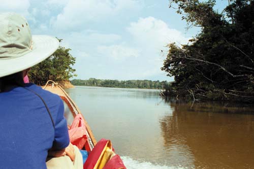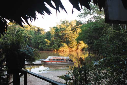 Peru, wunderbares Land der extremen Kontraste, lädt einmal mehr ein, um uns an seiner großartigen Natur zu erfreuen. Diesmal flogen wir nach Iquitos, um den Urwald an den Flüssen Amazonas, Napo und Sucusari kennenzulernen. Aus der Höhe betrachten wir das Meer, die peruanische Küste und die majestätischen Anden mit ihren schneebedeckten Bergen und dann die durch unzählige Bäume geformte unermessliche grüne Decke, die von plötzlich auftauchenden schlangenförmigen Flüssen durchzogen wird. Wie wunderbar! Das muß man erleben, um zu fühlen, wie beglückt wir in diesem Lande sind. In Iquitos angkommen wurden wir empfangen und mit dem Bus zum Ablegeplatz von Exploraciones Amazónicas gebracht. An Bord des dreistöckigen Schiffes Amazonas Queen begann die Fahrt auf dem Amazonas. Die großen Inseln machen es schwierig, die ganze Mächtigkeit des gewaltigen Stromes zu erkennen. Wir hatten angenehmes sonniges Wetter. Große und kleine Wasserfahrzeuge kreuzten unseren Weg. Ziel des Tages war ExplorNapo. Nach etwa zweistündiger Fahrt mit dem Schiff erreichten wir Ceiba Tops, eine erstklassige Unterkunft am Ufer des Amazonas, wo wir zu Mittag aßen. Der grösste Teil der Touristen, die mit uns auf dem Schiffe waren, blieb in Ceiba Tops, wo sie alle Annehmlichkeiten wie Klimaanlage, fließendes Warm- und Kaltwasser, Schwimmbecken, Jacuzzi, usw. finden, sowie ein köstliches Büfett im Speisesaal und einen hervorragenden Service.