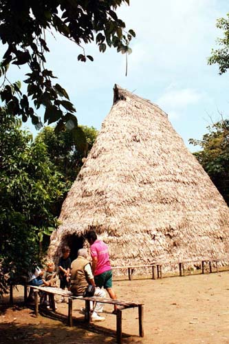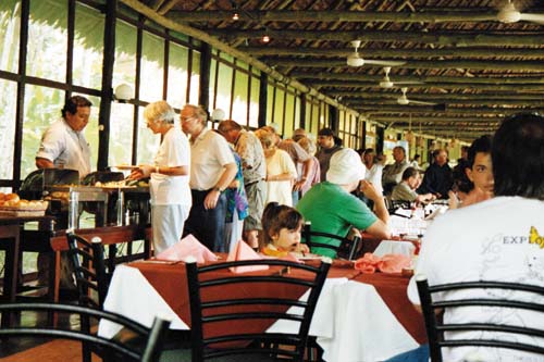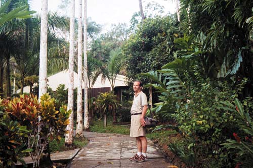 (Canopy walk way) weit drinnen im entlegenen Urwald (siehe Zeitschrift vom September) konnten Wenn sich die von Iquitos kommende Amazon Queen der Anlegestelle nähert kann man nicht erkennen, was das dichte Laub verbirgt. Nur eine die Baumgipfel etwas überragende Antenne lässt erahnen, dass es hier etwas mehr geben muß. Auf einem Pfad – mit Holz ausgelegt, um auch nach einem der üblichen Regenschauer nicht durch den Schlamm stampfen zu müssen – erreichen wir den Empfang an der Stirnseite eines aus Materialien des Waldes und im lokalen Stil erbauten großen Gebäudes. Während der Übergabe der Schlüssel für die Bungalows bedienen sich einige schon mit Kaffee, der Tag und Nacht – kostenlos – für die Gäste bereit steht. Nebenan die Bar, gefolgt von dem geräumigen Speiseraum. Die Mahlzeiten werden hier als Büfett serviert – in Vielfältigkeit und Qualität für anspruchsvolle Gäste. Ein Yacuzzi mit Hydromassage lädt gleich zum Entspannen im Wasser ein und wer sich nach mehr Aktivität sehnt, kann über die Wasserrutschbahn in das tiefer liegende, bei diesem warmen Klima so angenehmen Schwimmbecken eintauchen. Gut gepflegte Gartenanlagen laden zum Betrachten der typischen Urwaldpflanzen ein. Etwas abseits lädt ein geräumiger Saal mit Hängematten zum Ausruhen ein. Die Bungalows integrieren sich harmonisch in die Landschaft. Beim Öffnen der Türe überrascht die Frische der Klimaanlage und die tadellose Einrichtung mit privatem WC und Dusche. Fließendes Wasser, nicht nur kalt, es gibt es auch warm, und elektrisches Licht – als ob wir nicht inmitten des Dschungels wären. Mit allen Annehmlichkeiten kann man so den Tropenwald kennenlernen und die exotische Umgebung genießen. Natürlich sind auch viele Aktivitäten möglich und es gibt eine Menge zu sehen. Nach einer kurzen Wanderung durch den Wald erreichen wir einen großen Ceiba, ein riesiger Baum, der die schon ziemlich großen Bäume der Umgebung noch überragt. Sehr interessante Bewohner des tropischen Waldes, doch unter normalen Bedingungen nur recht schwer zu beobachten, sind die Affen. Auf der Affeninsel werden sie in besonderer Weise geschützt und gepflegt. Das ermöglicht, sie hier aus der Nähe zu beobachten, obwohl sie hier immer noch als wilde Affen leben. Das Boot bringt uns zu einer anderen Stelle und mit ein wenig Glück ist ein aus dem Wasser springender Delphin zu sichten. Vom Ufer des Amazonas führt uns ein Pfad zu einer Lichtung im Wald, wo ein Zeremonienhaus der Yaguas-Indianer errichtet ist. Mit der früher üblichen typischen Bekleidung erwarten sie uns und erzählen von ihrem Leben und ihren Gebräuchen. Besondere Aufmerksamkeit erregt das Blasrohr, das einige Yaguas bis heute zum Jagen verwenden. Eine gute Gelegenheit, selbst mal das Blasen zu probieren. Und es war viel einfacher als ich erwartete! Der Unterschied zu den als Souveniers angebotenen Blasrohren spürt man sofort am Gewicht. Als Andenken verkaufen die Indios Gegenstände ihres Kunsthandwerks. Ein eigenartiges Gefühl, ein Faultier, eines der sonderbarsten Tiere des Urwaldes, in den Händen halten.
