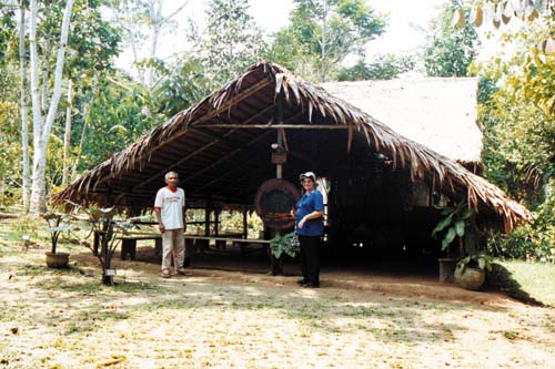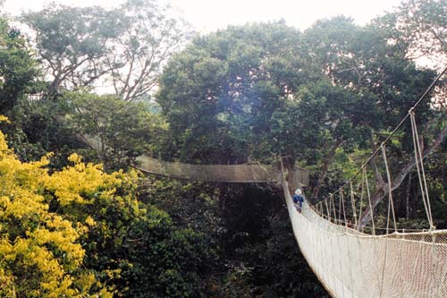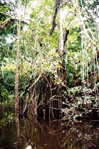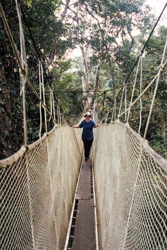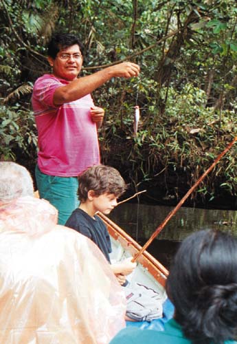 Nach dem Mittagessen setzten wir die Reise mit ganz unterschiedlichen Transportmitteln fort, kleines Boot mit Außenbordmotor, Mototaxi und schließlich ein größeres bedachtes Motorboot. Zunächst eine kurze Stecke auf dem Amazonas, eine kurze Landstrecke vom Amazonas zum Napo, auf dem Napo und zuletzt auf dem Sucusari. Von unserem Führer Orlando und den freundlichen Einheimischen immer gut geführt und umsorgt erreichten wir schließlich die Anlegestelle von ExplorNapo. Die Lodge ExplorNapo ist weitgehend mit örtlichen Materialien erbaut und an die natürliche Umgebung angepasst. Die Nacht verleiht ihm einen romantischen und mystischen Hauch. Die Lodge selbst ist mit Petroleumlampen schwach aber ausreichend erleuchtet. Die Klänge des nächtlichen Urwaldes, das Quaken der Kröten, das Zirpen der Grillen, Geräusche verschiedener Insekten und Vögel sind von überall her zu vernehmen und beflügeln unsere Phantasie. Die Moskitonetze über den Betten ermöglichen einen ungestörten Schlaf. Nach dem Frühstück (ein köstliches Büfett mit Fruchtsaft, Kaffee, Kräutertee, Milch und speziell für Explorama abgefülltes Trinkwasser) unternahmen wir während unseres Aufenthaltes Ausflüge. Am ersten Tag begannen wir im 7 Uhr früh einen Fußmarsch zu der Hängebrücke in den Baumwipfeln. Es überraschte mich, dass es nicht wie ich mir vorstellte eine Brücke war sondern eine Reihe von Brückenabschnitten, die an 14 der höchsten Bäume aufgehängt sind. Zur ruhigen Beobachtung dienen 8 Plattformen. Das ganze Brückensystem steigt bis auf 35 m Höhe an. Zusammen ergeben sich 500 m Brückenlänge, das weltweit längste System seiner Art. Erbaut wurde es von ausländischen freiwilligen Technikern und einem Peruaner, der sich nun um die Instandhaltung kümmert. Beim Bau wurde darauf geachtet, die Bäume nicht zu schädigen. Erbaut wurde das Brückensystem für wisenschaftliche Forschungen, ist aber nun auch für Touristen zugänglich. Brücken und Plattformen bieten durch die Höhenlage in und über den Baumkronen ganz außergewöhnliche Positionen zum Beobachten des Urwaldes. In den Wipfeln der Bäume ist im Urwald sehr viel Leben vorzufinden: viele Vogelarten, Affen, Eichhörnchen, Insekten, usw. und eine ebenso große Anzahl von Pflanzen, die sich auf den Bäumen entfalten: Orchideen, Bromelien, Philodendron, Lianen, die von weit oben bis auf den Boden herunterhängen. Die Höhe der Bäume und die dichte Vegetation (nur etwa 2% bis 3% des Lichtes erreichen den Urwaldboden) bilden eine feuchte und schattige Atmosphäre. So sind auch vielgestaltige Pilze zu beobachten. Eine Ameisenart schneidet Teile von Blättern ab und transportiert diese zum Ameisenbau. Das erweckt den Eindruck, als ob sich die Blätter selbst fortbewegten. Die Brücke verlassend machten wir uns auf dem Weg zum ethnobotanischen Garten, wo uns ein Chaman erklärte, für was die angebauten Pflanzen verwendet werden, z.B. Uña de gato (Katzenkralle) gegen Entzündugen, Verbena (Eisenkraut) bei Asthma, Maracuya (Passionsfrucht), «Boton de oro» als schmerzstillendes Mittel, kleine rote und gelbe Ajis, ... Zum Mittagessen kehrten wir zur Lodge zurück. Ein köstliches Büfett erwartete uns: Fisch (Lachs-Salmler), Bohnen, Jukka, Bananen, Kohlsalat mit Tomate, Melone, Ananas, Wasser, Kaffee, ... Am Nachmittag fuhren wir mit einen kleinem Boot zu einem kleinen See, um einen vorgeschichtlichen Vogel, den Hoatzin, aufzuspüren. Das ist der einzige wiederkäuende Vogel (er hat zwei Mägen). Auf dem Weg konnten wir eine Menge Vögel (wie z.B. Goldamsel, Aras, Papageie, Tukane, Falken), Schmetterlinge (darunter der schöne Morphofalter mit dem intensiven Blau seiner Flügel) und Fledermäuse beobachten. In einem der Bäume bewegte sich langsam ein Faultier. Am See angekommen hielten wir an einer Stelle mit Ameisenbäumen. Diese hochgewachsenden Bäume sind von unzähligen agresiven Ameisen bevölkert, die sich sofort auf alle Eindringlinge stürzen und den Baum verteidigen. Das Faultier, das auch diesen Baum bevorzugt, lässt sich dadurch aber keineswegs aus der Ruhe bringen. Schon beim vorsichtigen Annähern ließen sich die Hoatzins lautstark vernehmen. Trotz ihrer Größe waren diese ungeschickt fliegenden Vögel mit dem Federbusch auf dem Kopf nur schwer zu sehen. Zurück zur Lodge und nach dem Abendessen erneut Ausfahrt, um den Urwald in der Nacht zu erleben. Im Licht der Taschenlampen versuchten wir etwas Bewegung in den nahen Bäumen auszumachen. Es war uns leider nicht vergönnt, eines der nachtaktiven Tiere erspähen zu können, doch zogen uns die Geräusche des nächtlichen Urwaldes in ihren Bann. Die tiefe Nacht wurde nur ab und zu durch das Licht einiger vorbeischwirrender Leuchtkäfer unterbrochen. Ich dachte «welch eine Ruhe fühlt man in dieser unermesslichen Dunkelheit». Zurück in der Lodge begaben wir uns auf dem spärlich beleuchteten Pfad zu unserem Zimmer, wo uns eine brennende Lampe erwartete. In der Nacht regnete es – wir befanden uns im Regenwald. Trotz Regen machten wir uns nach dem Frühstück in offenem Boot auf den Weg, um Pirañas zu fischen. Nass von unten und von oben war der Weg auf dem Sucusari bis wir in einen kleinen Nebenfluss einfuhren, dessen schwarzes Wasser vom lehmigbraunen Farbton des Sucusari deutlich abstach. Orlando erklärte uns, dass die schwarze Farbe durch die ins Wassers fallenden Blätter der hier wachsenden Bäume entsteht ... und hier leben die Pirañas. Manchesmal weitet sich der Wasserlauf etwas und wird dann durch die dichte Vegetation wieder verengt. Ins Wasser gefallende Bäume wachsen weiter. Die Luftwurzeln anderer Pflanzen hängen bis zum Wasser herab. Ein Wirrwarr von sich in der Luft verflechtenden Zweigen, Wurzeln und Stämmen gibt den Eindruck einer misteriösen Szene. Von unserer Annäherung aufgestreckt erheben sich Vögel, Fledermäuse und Schmetterlinge in die Luft. Es hatte aufgehört zu regnen und wir erreichten eine stille Stelle zum Fischen. Orlando reicht u