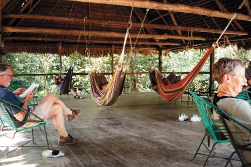 Peru, wunderbares Land der extremen Kontraste, lädt einmal mehr ein, um uns an seiner großartigen Natur zu erfreuen. Diesmal flogen wir nach Iquitos, um den Urwald an den Flüssen Amazonas, Napo und Sucusari kennenzulernen. Aus der Höhe betrachten wir das Meer, die peruanische Küste und die majestätischen Anden mit ihren schneebedeckten Bergen und dann die durch unzählige Bäume geformte unermessliche grüne Decke, die von plötzlich auftauchenden schlangenförmigen Flüssen durchzogen wird. Wie wunderbar! Das muß man erleben, um zu fühlen, wie beglückt wir in diesem Lande sind. In Iquitos angkommen wurden wir empfangen und mit dem Bus zum Ablegeplatz von Exploraciones Amazónicas gebracht. An Bord des dreistöckigen Schiffes Amazonas Queen begann die Fahrt auf dem Amazonas. Die großen Inseln machen es schwierig, die ganze Mächtigkeit des gewaltigen Stromes zu erkennen. Wir hatten angenehmes sonniges Wetter. Große und kleine Wasserfahrzeuge kreuzten unseren Weg. Ziel des Tages war ExplorNapo. Nach etwa zweistündiger Fahrt mit dem Schiff erreichten wir Ceiba Tops, eine erstklassige Unterkunft am Ufer des Amazonas, wo wir zu Mittag aßen. Der grösste Teil der Touristen, die mit uns auf dem Schiffe waren, blieb in Ceiba Tops, wo sie alle Annehmlichkeiten wie Klimaanlage, fließendes Warm- und Kaltwasser, Schwimmbecken, Jacuzzi, usw. finden, sowie ein köstliches Büfett im Speisesaal und einen hervorragenden Service.